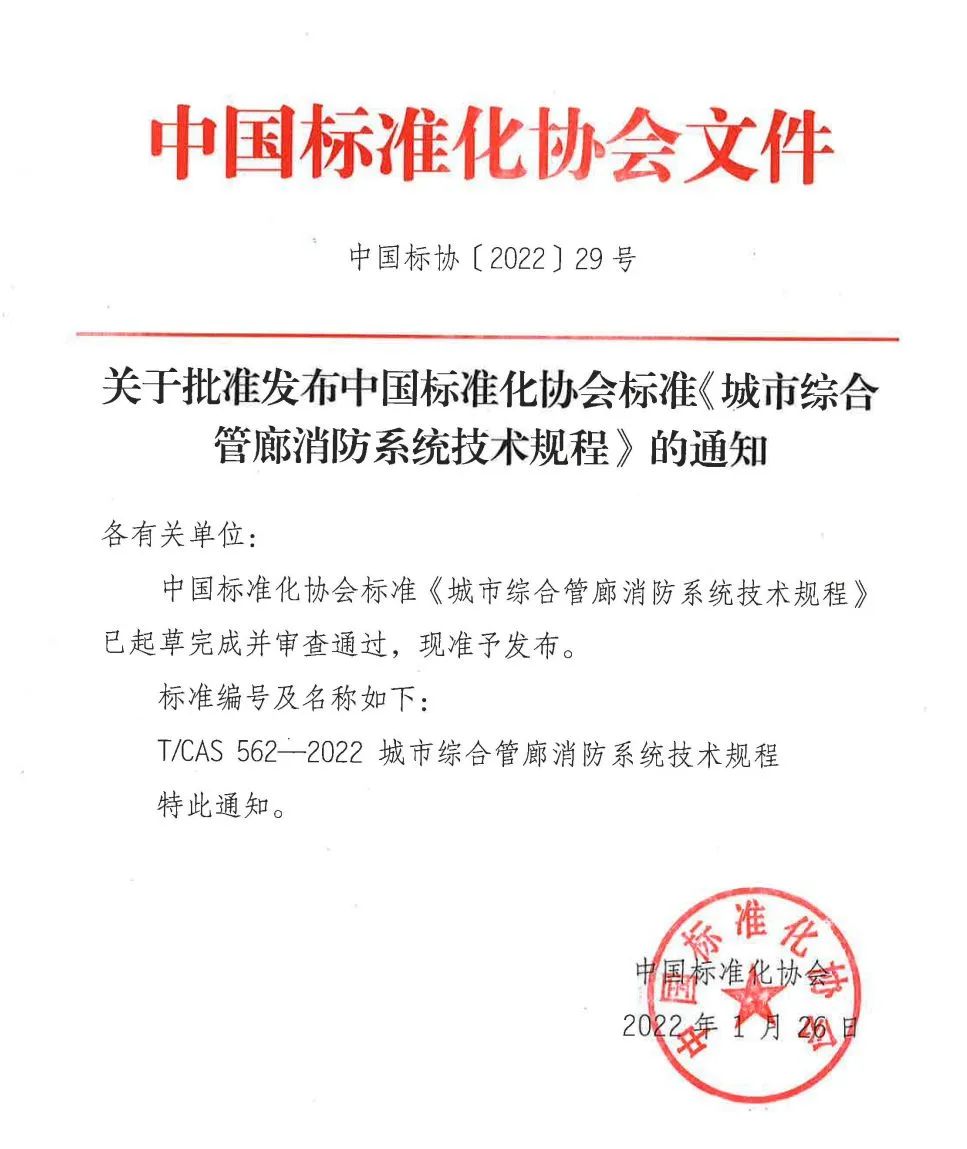 由我司参编的《城市综合管廊消防系统技术规程》(以下简称《规程》),经中国标准化协会正式发布,标准编号:T/CAS 562-2022,自2022年1月26日起实施。